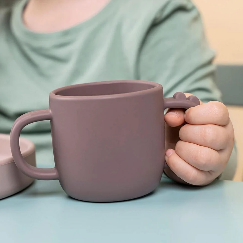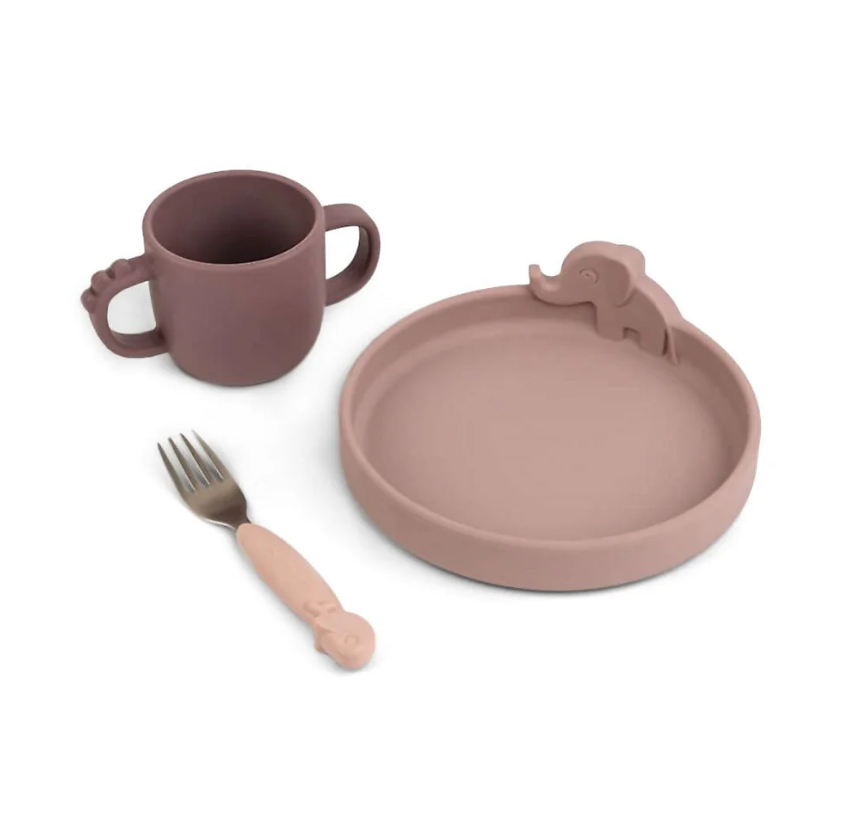 El set de comer incluye un plato, un tenedor y una taza con dos asas; todos ellos hechos de silicona de grado alimenticio.