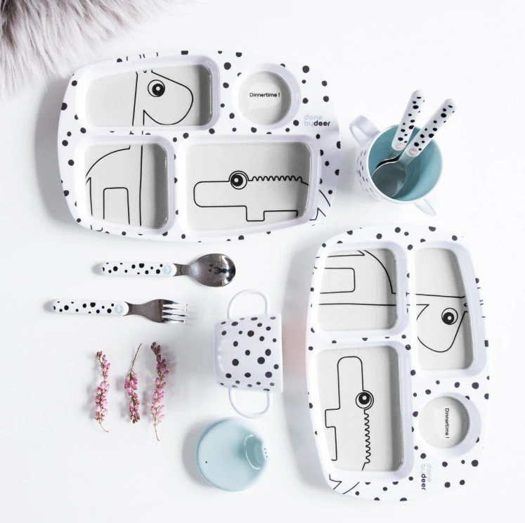 ¡Llegó la hora de comer para ti y tus amigos Deer! El Set Vajilla 2 piezas + Set de Cubiertos Happy Dots para niños pequeños, incluye un inteligente plato con compartimientos que separa la comida, exactamente como les gusta a ellos, una taza con un asa que cabe uno de los compartimientos del plato y un set de cubiertos (tenedor y cuchillo) perfectamente diseñados para esos dedos pequeños. El diseño monocromático en blanco y negro con puntos combina elegantemente con el color gris.